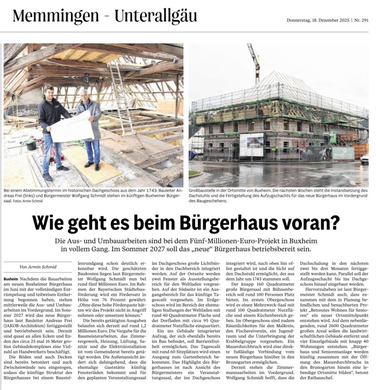 Die Memminger Zeitung berichtet am 18.12.2025 über den Baufortschritt im Bürgerhaus Buxheim.